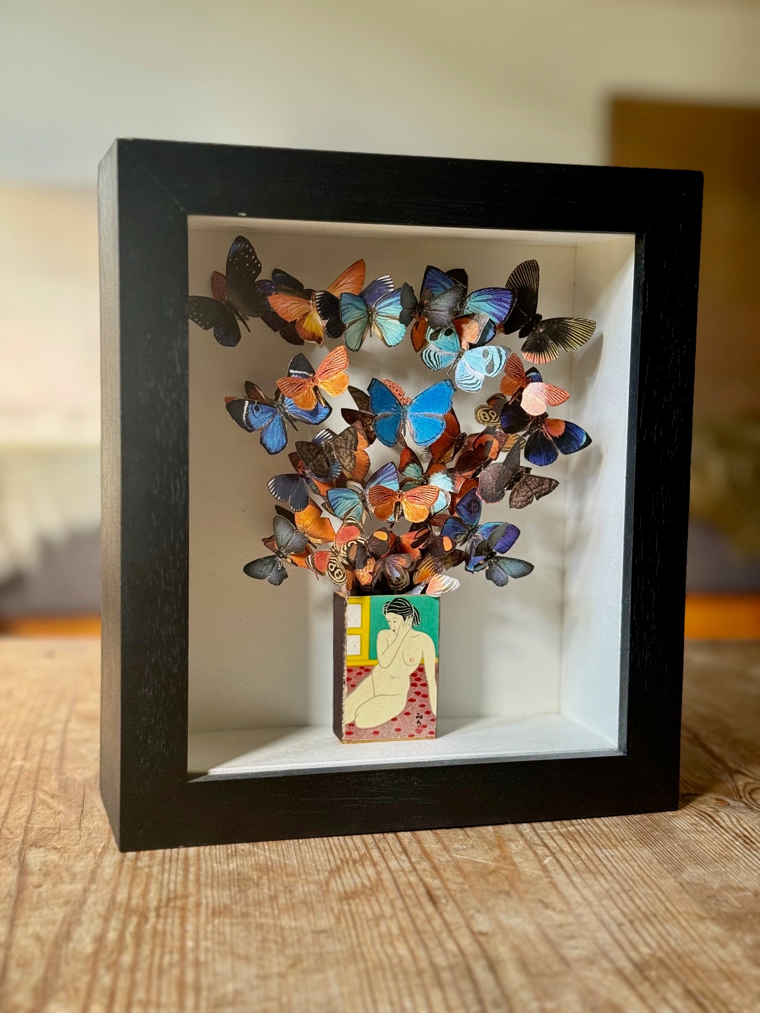 Vintage matchbox with butterflies cut from wildlife identification books.